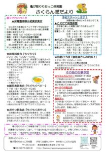 2026.03.23 お知らせ りりおっこぷらす金町・4月イベント情報 子育てひろば「りりおっこぷらす金町」4月イベント・カレンダーの更新を行いました。 こそだて英語教室 や ベビーマッサージ教室 の春夏コース予約が4月1日より開始されます。 また、保育所体験&給食試食会 を「4月18日(土)」に初の土曜日開催いたします。 平日にはなかなか参加できない!という方必見です♪ 詳細はお便りをご覧ください イベント予約専用LINEは ➡ こちら